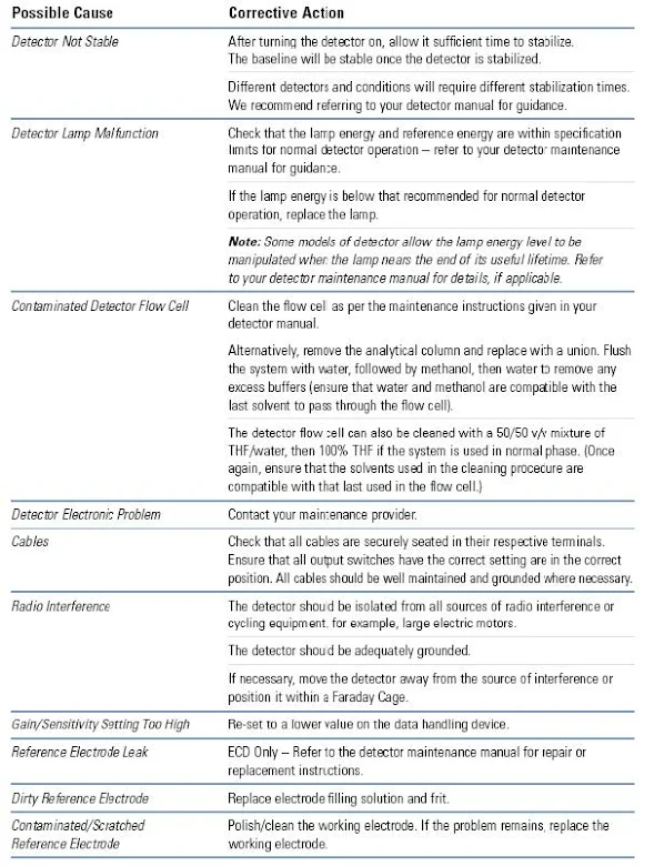 - To isolate the source of a baseline irregularity, it is important to determine whether the problem lies with the fluid path, detector or electrical connections. This can be achieved by following the simple steps below: